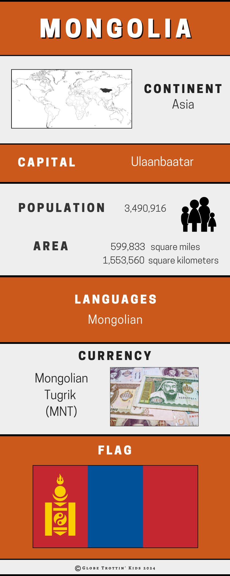 Mongolia, located in East Asia, is known for its vast landscapes of rolling grasslands, deserts, and rugged mountains. The nomadic lifestyle of the Mongolian people has been a central part of their culture for centuries, with many still living in traditional felt tents called gers. The country's rich history includes the mighty Mongol Empire, led by Genghis Khan, who conquered much of Asia and Europe in the 13th century. Traditional Mongolian music, throat singing, and wrestling are important cultural traditions that showcase the unique heritage of this fascinating country.