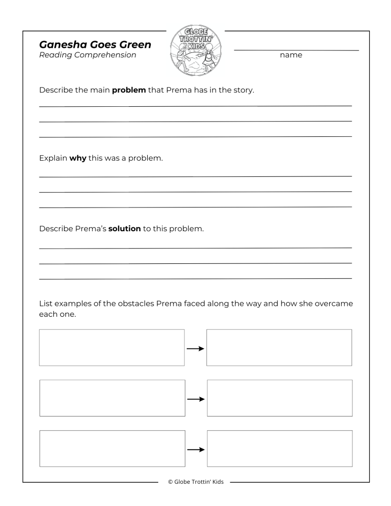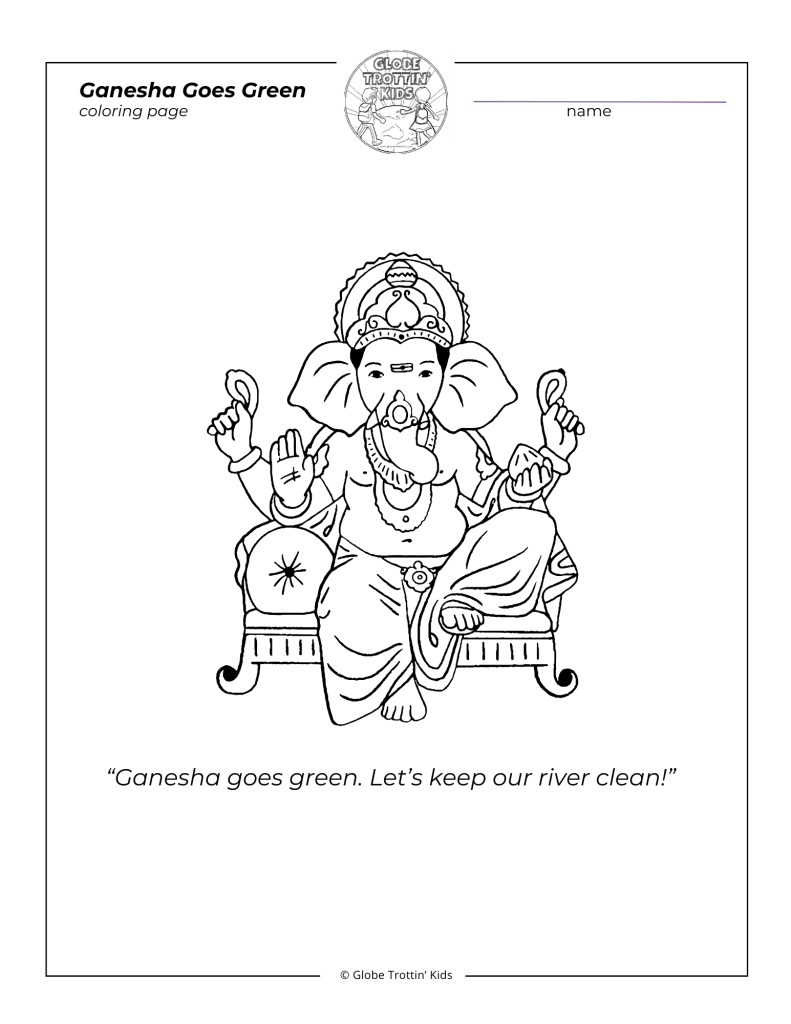 - Ganesha Coloring Page: Use this quote from the story to help you write or tell a summary of the book. “Ganesha goes green. Let’s keep our river clean!” Click here to download the coloring page.